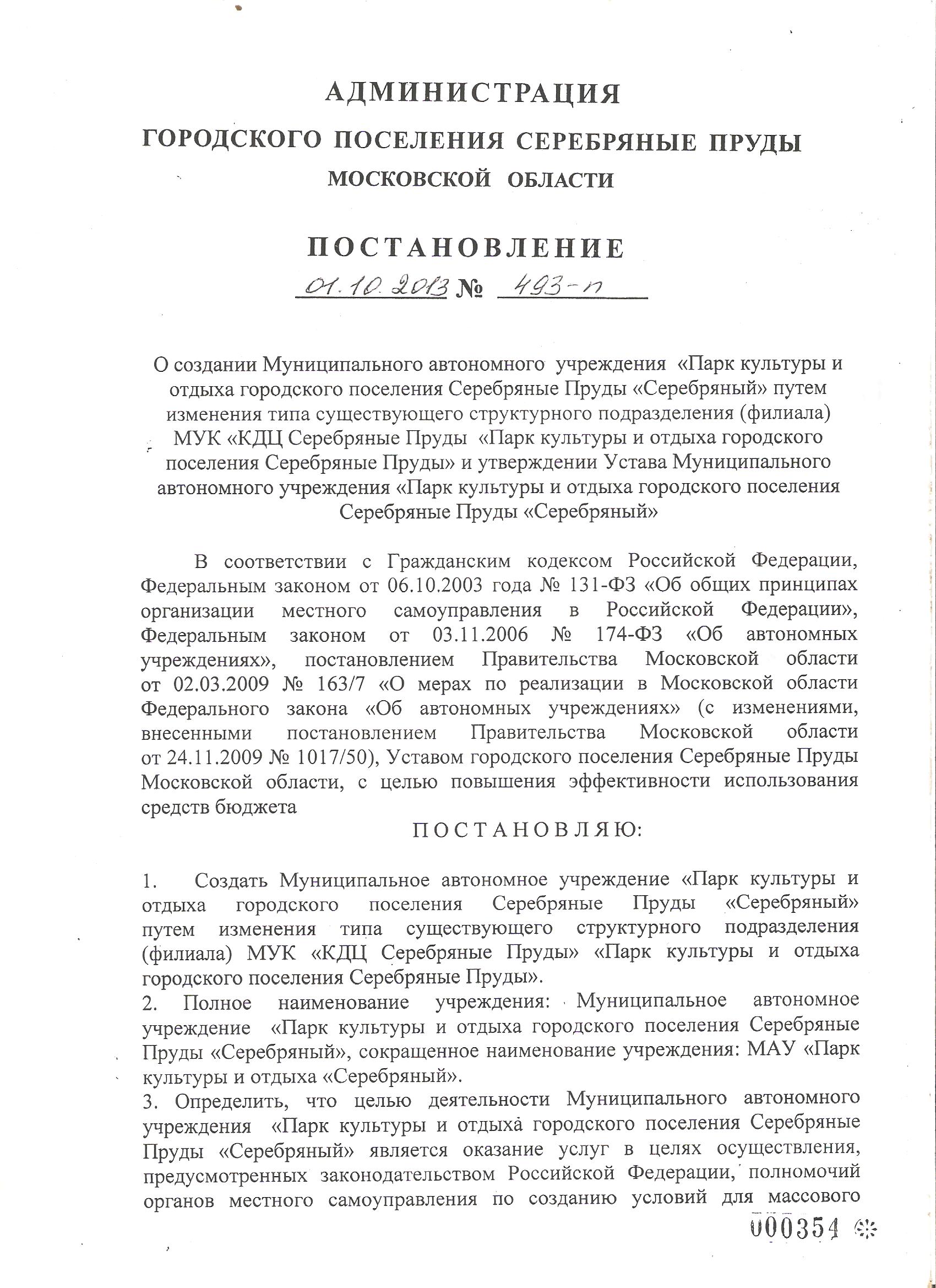 О создании Муниципального автономного учреждения «Парк культуры и отдыха городского поселения Серебряные Пруды «Серебряный» путем изменения типа существующего структурного подразделения (филиала) МУК «КДЦ Серебряные Пруды «Парк культуры и отдыха городског
