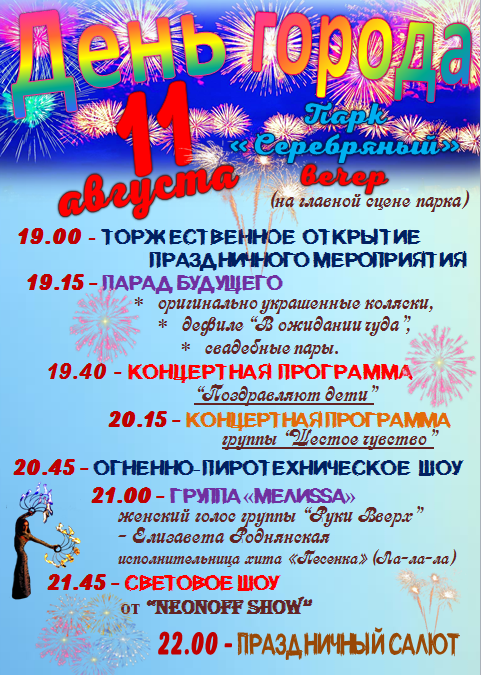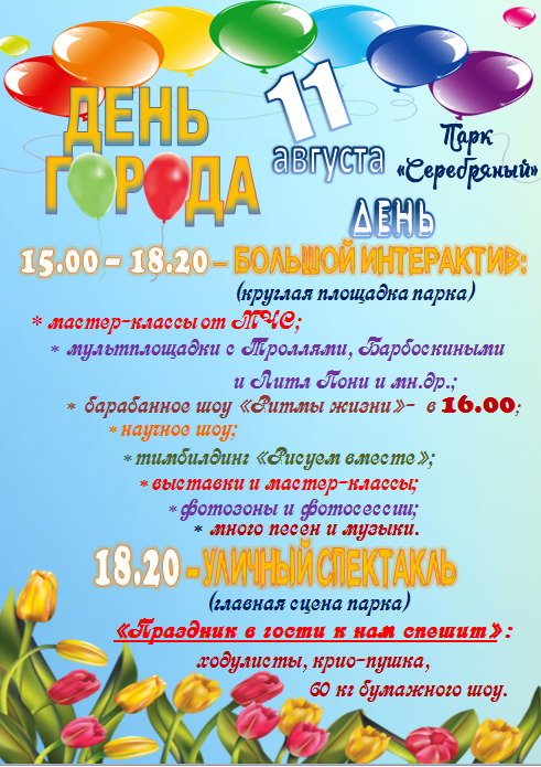 Уважаемые жители г.о. Серебряные Пруды! Празднование Дня города состоится 11 августа на территории парка культуры и отдыха "Серебряный"