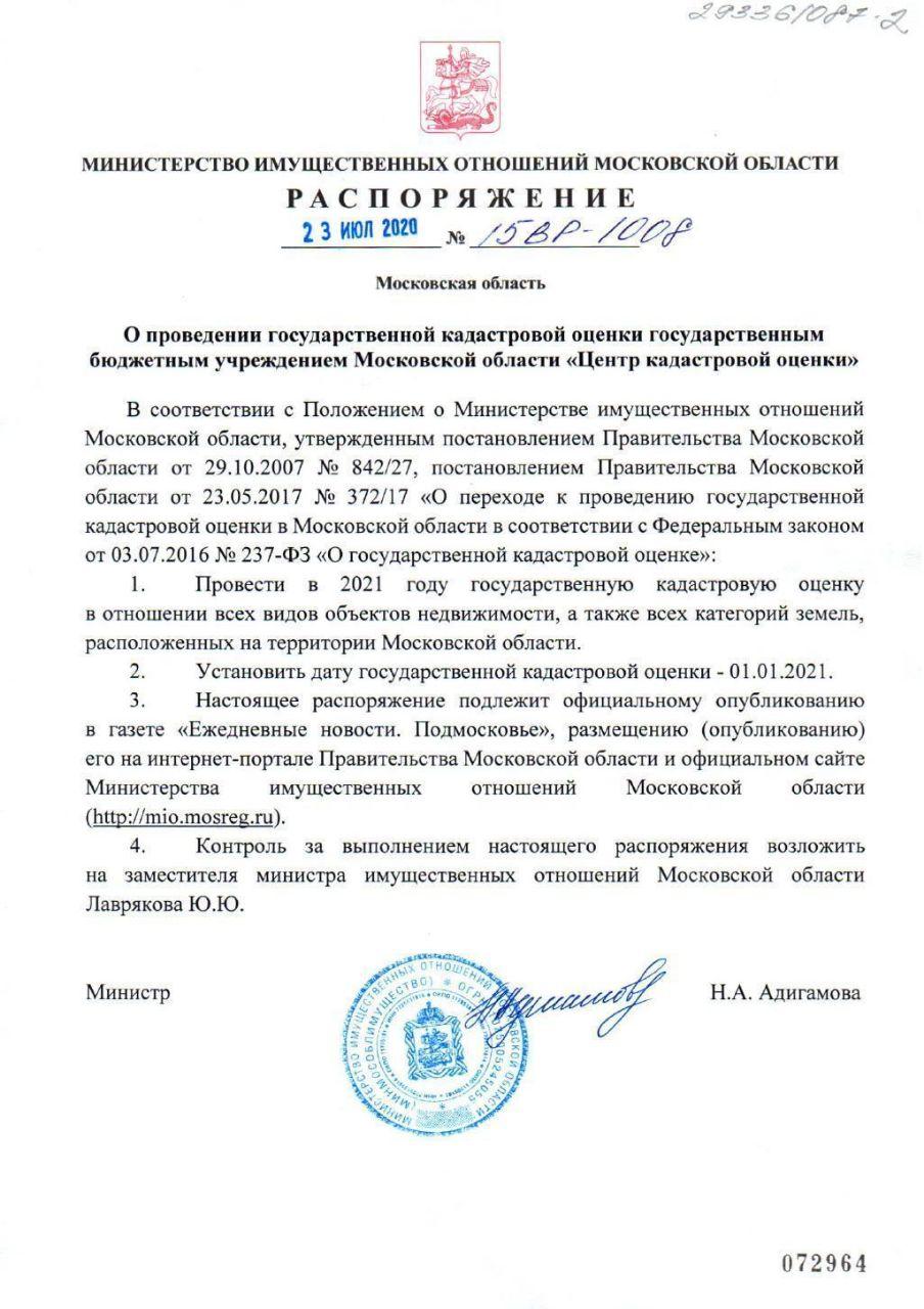 Администрация городского округа Серебряные Пруды Московской области информирует Вас о том что в соответствии с Распоряжением Министерства имущественных отношений Московской области от 23.07.2020 № 15ВР-1008 «О проведении государственной кадастровой оценки государственным учреждением Московской области «Центр кадастровой оценки» (прилагается), принято решение о проведении государственной кадастровой оценки в отношении всех видов объектов недвижимости, а также всех категорий земель, расположенных на территории Московской области.